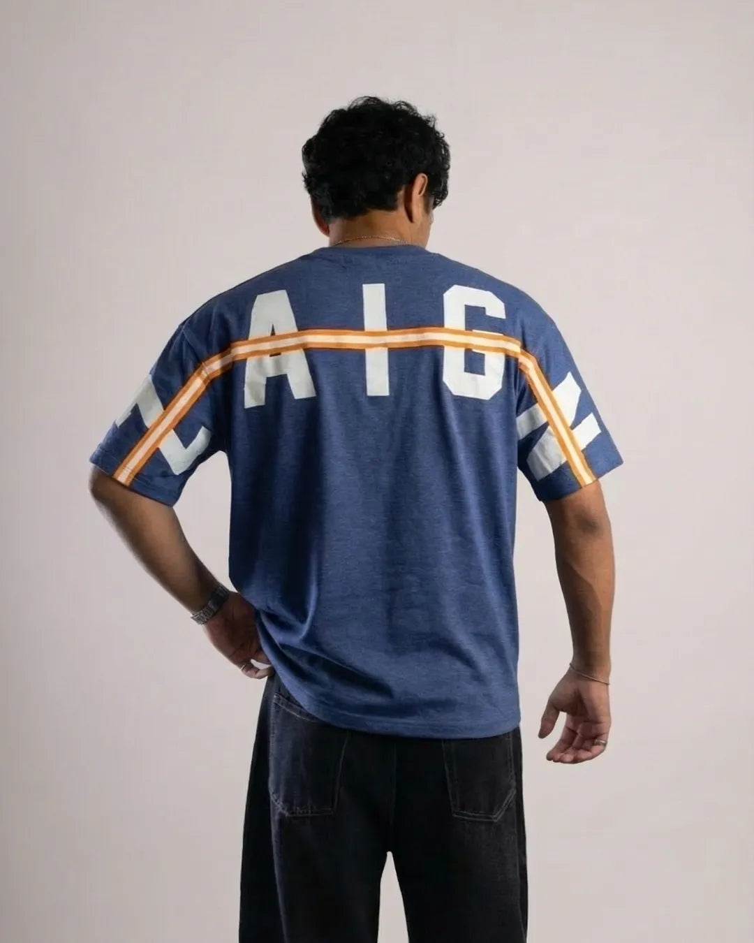 Saffron Split is where bold color meets statement design. Crafted from soft, breathable fabric, this unisex T-shirt stands out with its deep blue base, contrasting saffron stripe, and oversized back typography. Designed for those who like their everyday style to speak louder—without trying too hard.